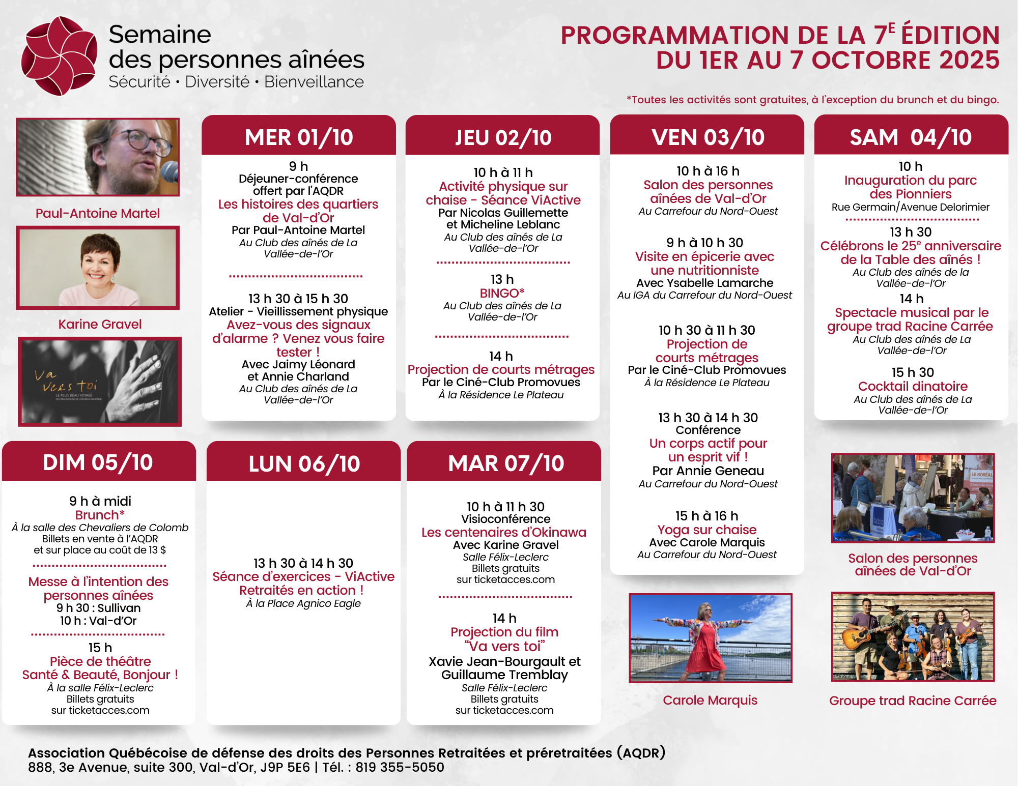 La Semaine des personnes aînées se veut une semaine d’activités qui illustre l’apport des personnes aînées dans la société, en plus de briser l’isolement de celles-ci. Cela permet de rejoindre l’ensemble de la population de Val-d’Or et des environs; c’est encore plus vrai pour la population aînée. Elle est issue d’une initiative de la Table de concertation des ainées de Val-d’Or et elle est encadrée par le comité organisateur de la Semaine des personnes ainées. Cette année, encore une fois, le comité organisateur a su prouver l’importance de cette activité qui met de l’avant les personnes aînées dans la MRC de la Vallée-de-l’Or.